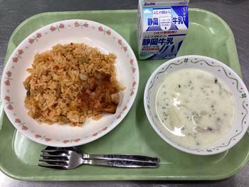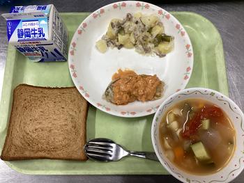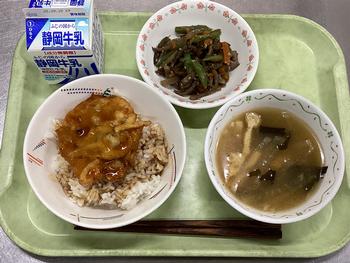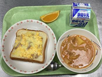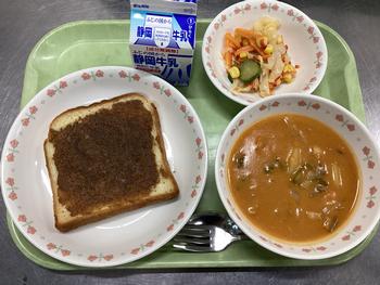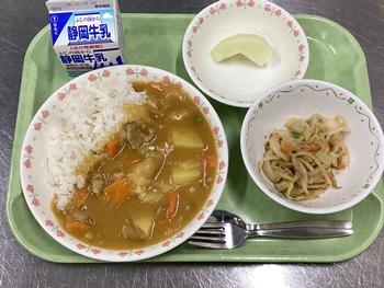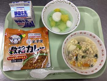 メニュー 【防災給食】 震災等で給食室が使えなくなった時のために、学校には備蓄品として今日のカレーを備蓄しています。防災教育もかねて、給食で食べました。 |