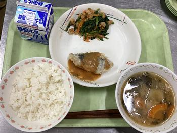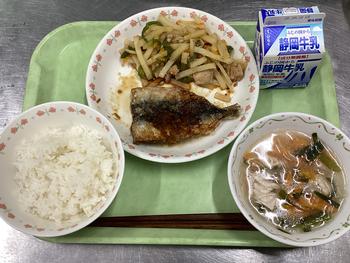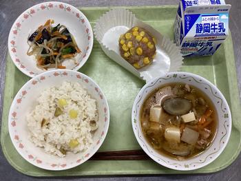 メニュー 【敬老の日(まごはやさしい)メニュー】 昨日の敬老の日とかけて「ま・ご・わ・や・さ・し・い」メニューです。健康な食生活に役立つバランスのよい食事のための和の食材の頭文字で「豆、ごま、わかめなどの海藻、野菜、魚、椎茸、芋」となります。 |