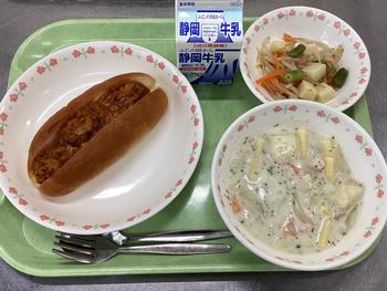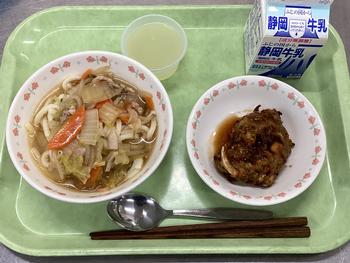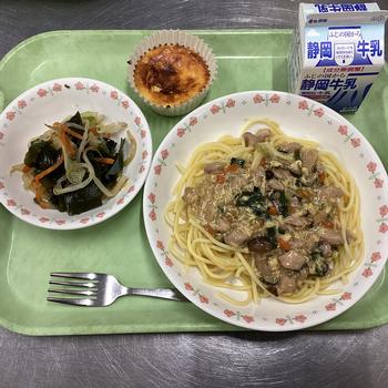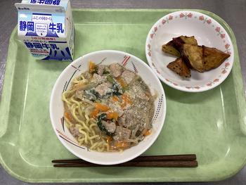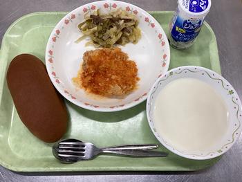 メニュー とんこつラーメン 豚の頭骨や背骨を強火で長時間煮込み、骨髄から出るコラーゲンやうま味成分を乳化させた白濁した濃厚スープが特徴の福岡県久留米市発祥のラーメンです。学校給食では、食材は食べる当日の朝に納品されなければいけないルールや厳しい衛生管理で作られるため、豆乳で白濁したスープを表現しました。