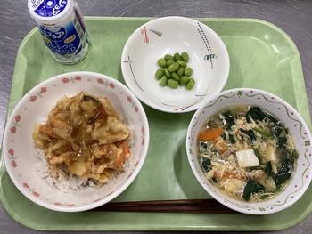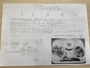 メニュー 3年5組げんきこまどん 狛江市の農業について勉強した3年5組がこま丼のメニューを考えてくれました。先月、先々月とクラス毎に使う野菜や味で個性を出していて、今回はかき揚げにバター醤油のタレをかけました。また、副菜と汁物も考えてくれ、栄養バランスのよい献立になっています。 |