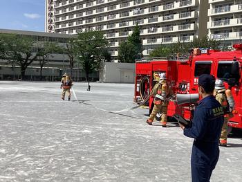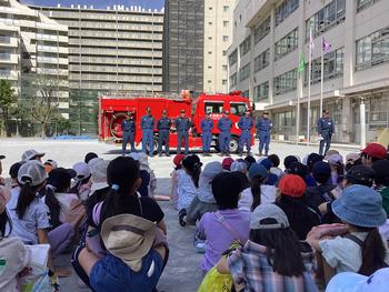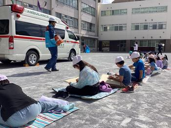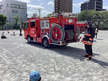 青空の下、毎年恒例「消防写生会」が行われました。町の人々の命を守る消防士さんから、消防車や救急車を紹介して頂きました。間近でみる消防車は迫力満点。消防写生会を通して、人々の生活を守る仕事について考えることができました。