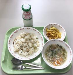 じゃこベー菜飯 牛乳 スパイシーポテト ビーフンスープ