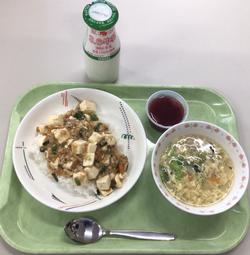麻婆丼 牛乳 中華風コーンスープ 手作りぶどうゼリー
