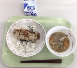 ゆかりご飯 牛乳 メルルーサのかわりソースかけ☆ 豚汁☆