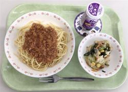 スパゲッティミートソース のむヨーグルト(ブルーベリー) 温野菜のドレッシングぞえ