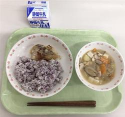 黒米の赤飯 牛乳 肉じゃが お祝いすまし汁