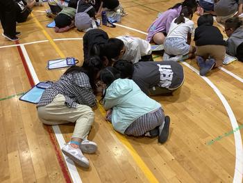 9月25日(木)に4、5、6年生を対象に笑顔と学びのプロジェクトが行われました。今回は、子どもたちが体育館に閉じ込められた中で、グループのみんなで扉の開くおまじないの合言葉を探すためになぞ解きをしていく活動でした。子どもたちはグループの友達と協力しながら一生懸命になぞ解きにチャレンジしていました。みんなで謎が解けた時は、大喜びでした。子どもたちの笑顔が見られた時間でした。