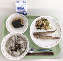 梅茶漬け 牛乳 ししゃものカレー揚げ 煮びたし じゃが芋もち