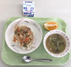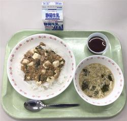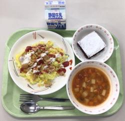 家常豆腐丼 牛乳 中華風オニオンスープ 不知火