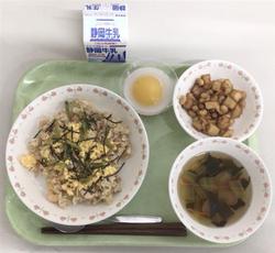 ゆかりご飯 牛乳 メルルーサのかわりソースかけ 煮びたし かきたま汁