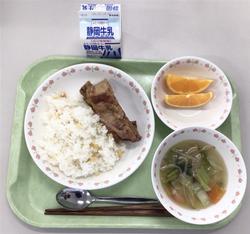 とうもろこしご飯(アルファ化米) 牛乳 スペアリブのマーマレード煮 野菜スープ 清見オレンジ