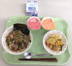 しょう油ラーメン 牛乳 豆入り野菜チップス シャーベット(みかん・りんご)