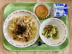 和風おろしスパゲッティ ハーブサラダ ぐりとぐらのカステラ 牛乳