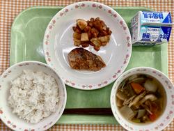 ご飯 魚のピリ辛焼き 大豆とじゃがいもの甘辛煮 きのこ汁 牛乳