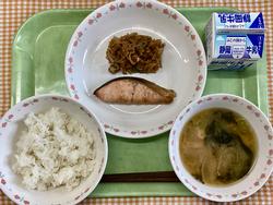 ご飯 さけの照り焼き 切干大根の煮つけ みそ汁 牛乳