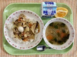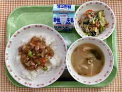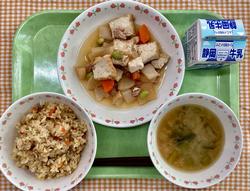 高野豆腐のそぼろご飯 鶏肉と大根のうま煮 みそ汁 牛乳