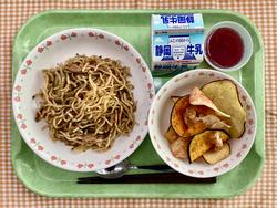 ソース焼きそば 豆入り野菜チップス 手作りぶどうゼリー 牛乳