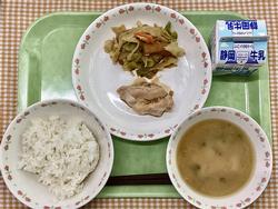 ご飯 鶏肉のレモン醬油がけ キャベツとさつま揚げの煮物 みそ汁 牛乳