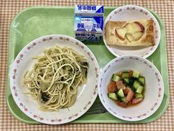 じゃことキャベツの和風スパゲッティ トマトときゅうりのドレッシング添え アップルパイ 牛乳