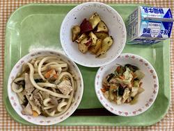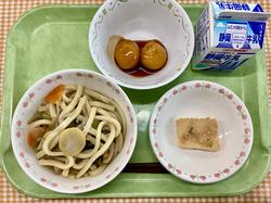 すき焼きうどん 大学芋 煮びたし 牛乳