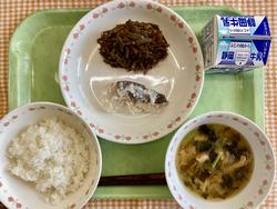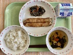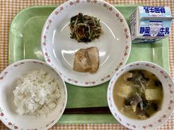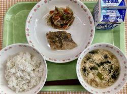 ごはん 魚のねぎみそ焼き 野菜のおかか和え かきたま汁 牛乳