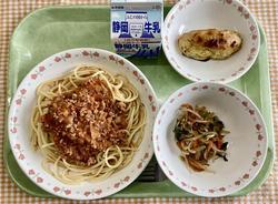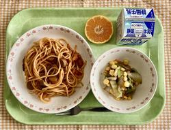 スパゲッティミートソース 糸寒天と野菜の和え物 スイートポテト 牛乳