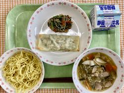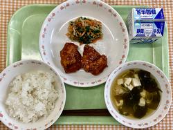 ご飯 鶏肉のレモン醬油がけ 三色おひたし たぬき汁 牛乳
