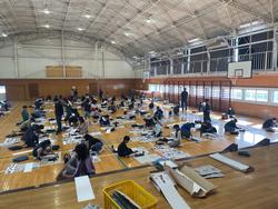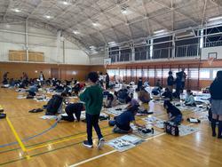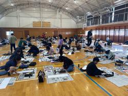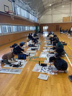 みんなで体育館に集まって道具を広げ、いつもとは少し違った緊張感の中、集中して書くことができました。