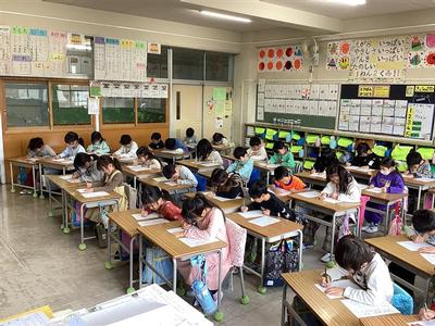 小学校に入学して初めての「書き初め」では、どの子も集中して練習に取り組んでいました。教室内は、文字通り「シーン」と静まり返り、お手本の文字をよく見て真剣に取り組む子供たちの表情が印象的でした。