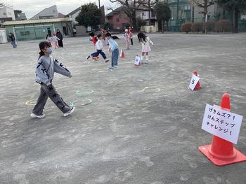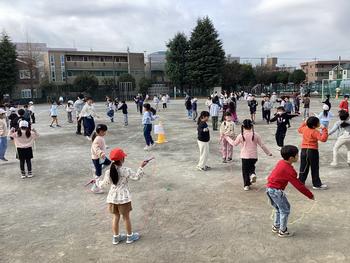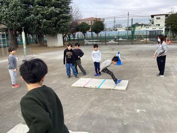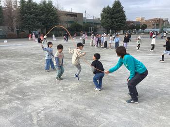 朝学習と中休みに、縄跳びだけでなく様々な「とぶ」運動の場を設定し、自由に参加できます。