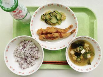 ゆかりごはん ししゃもフライ キャベツのしおこんぶあえ オクラとわかめのすましじる ぎゅうにゅう