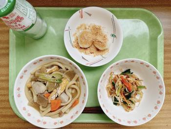 にこみうどん にくだんごのきっかむし だいこんサラダ ぎゅうにゅう