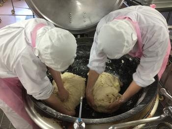 大きな釜でパン生地をこね、一次発酵。膨らんだ生地を分割して丸め、二次発酵させたらオーブンで焼きます。