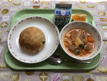 てづくりえだまめチーズパン トマトポトフ オレンジ ぎゅうにゅう