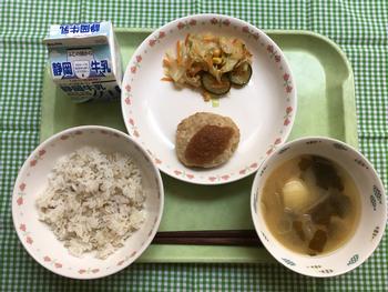 むぎごはん とうふハンバーグのおろしソースかけ じゃこいりサラダ みそしる ぎゅうにゅう