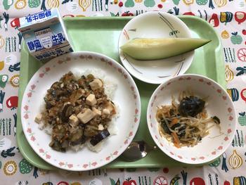 なすいりマーボーどうふどん わかめともやしのナムル メロン ぎゅうにゅう