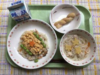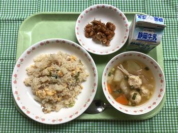 レタスチャーハン にくだんごととうがんのスープ だいずとじゃこのあげに ぎゅうにゅう