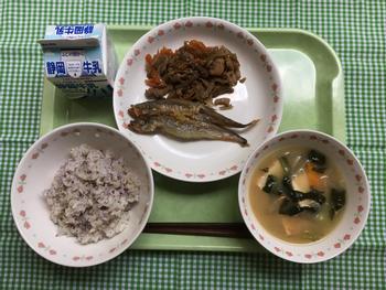 かみかみゆかりごはん ししゃものなんばんづけ ごもくきんぴら なまあげのみそしる ぎゅうにゅう