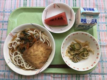 ひやしきつねうどん もやしときゅうりのすのもの すいか ぎゅうにゅう