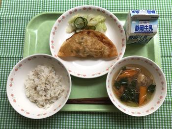 むぎごはん ジャンボぎょうざのあまずあんかけ やさいのしおナムル ちゅうかスープ ぎゅうにゅう