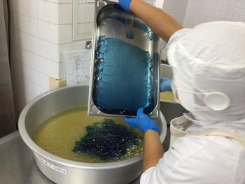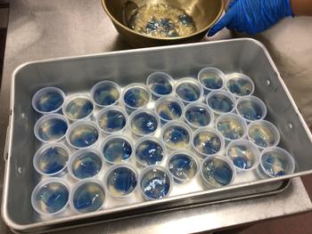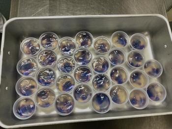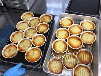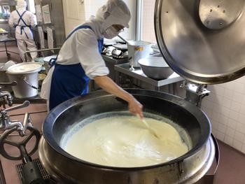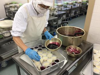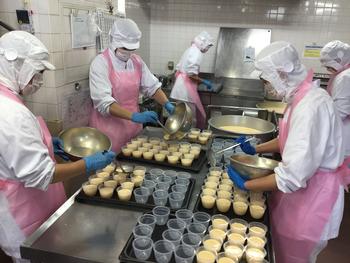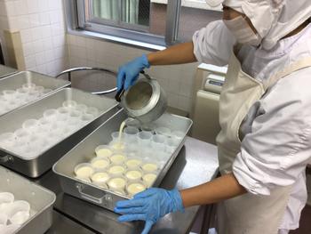 豆乳は分離しやすいので、沸騰させないようにやさしく加熱します。パートさんたちが集合したら、一番にプリン液の流し込みを行います。(やかんを使ってカップに注ぎます。)2時間ほど置き固まったら、配缶直前にソースをかけてクラスに提供します。