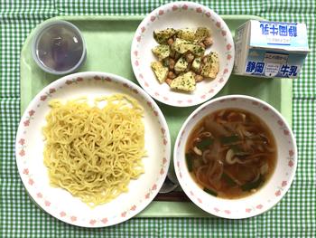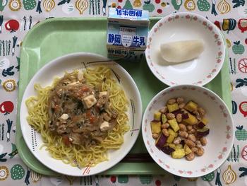 マーボーもやしやきそば さつまいもとだいずのからあげ なし ぎゅうにゅう