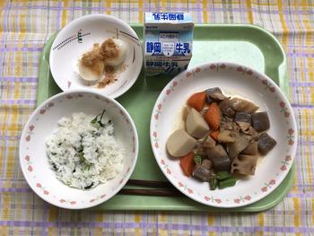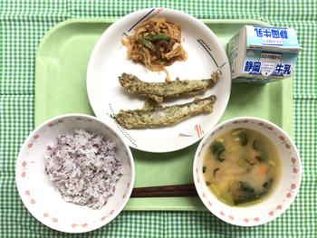 ゆかりごはん ししゃものいそべあげ きりぼしだいこんのいために やさいのみそしる ぎゅうにゅう