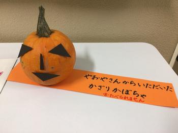 さて、今月はハロウィンということで、八百屋さんから飾りかぼちゃを頂きました。