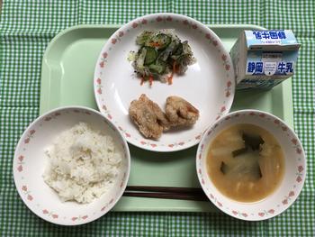 ごはん とりにくのしおからあげ やさいのゆかりあえ みそしる ぎゅうにゅう