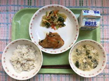 むぎごはん さめのやさいあんかけ あぶらあげいりおひたし かんぴょうのたまごとじ ぎゅうにゅう