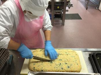 卵焼きやケーキ類などは、深めの鉄板に生地を流して焼き、出来上がったら鉄板から外して人数分にカットします。均等な大きさになるようまっすぐ切るのは職人技です。