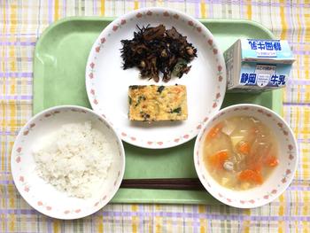 ごはん ちぐさやき ひじきとだいずのにもの どさんこじる ぎゅうにゅう