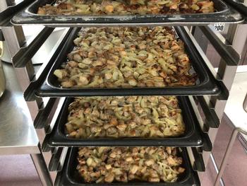 今日はセレクト給食なので、2種類の焼き料理を作るのに、仕込みも2通り、オーブンも2つの料理を交互に焼くなどして大忙しでした。