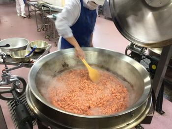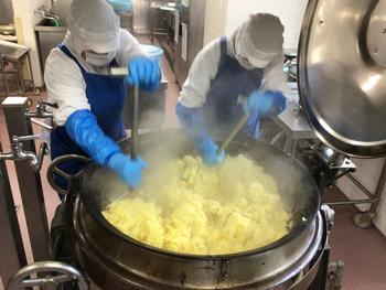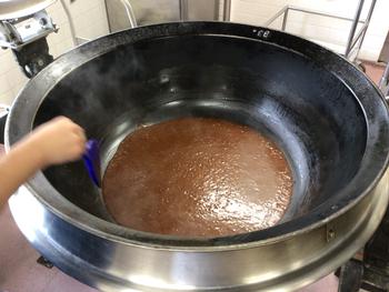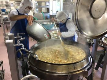 とろみをつけると汁が重くなり、かき混ぜるのにかなり力が要ります。調理員さんがしっかり腰を入れて混ぜてくれています。